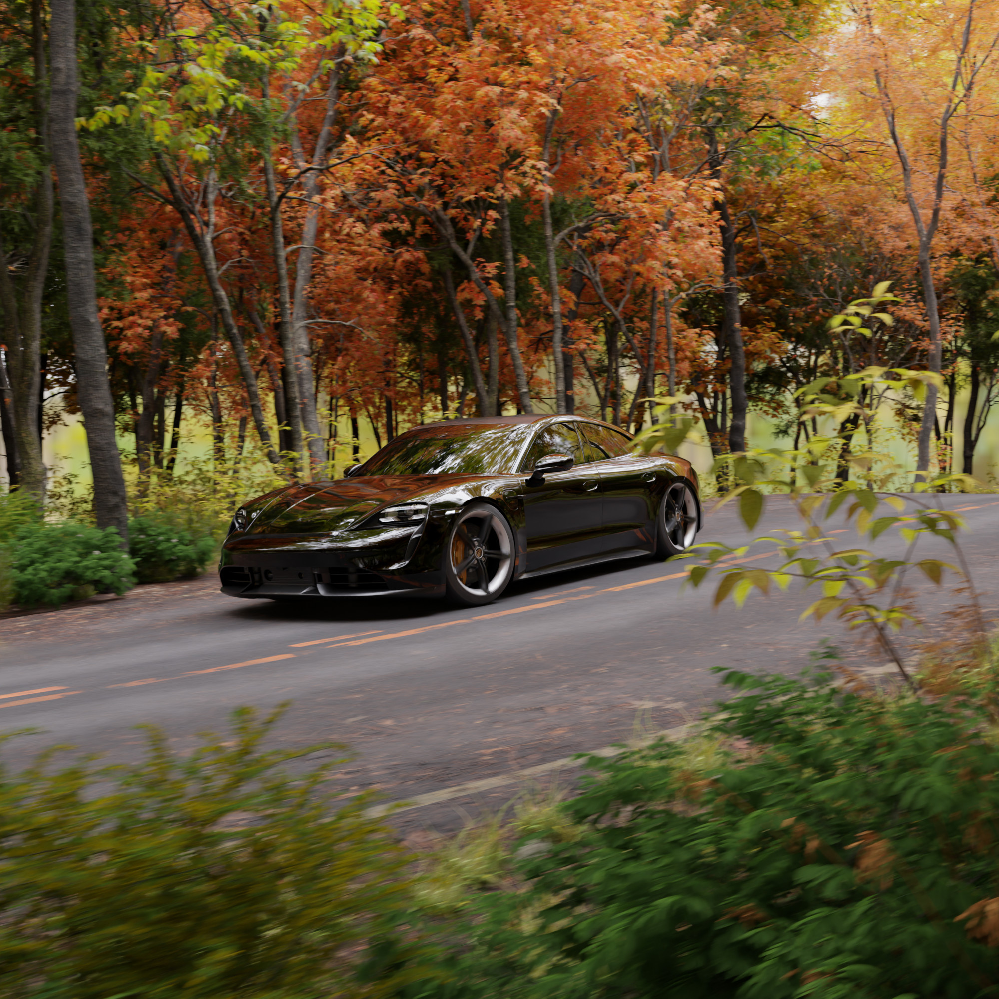 A personal project focused on creating a high-fidelity automotive animation, showcasing detailed modeling, realistic materials, and dynamic lighting in an atmospheric autumn forest scene.